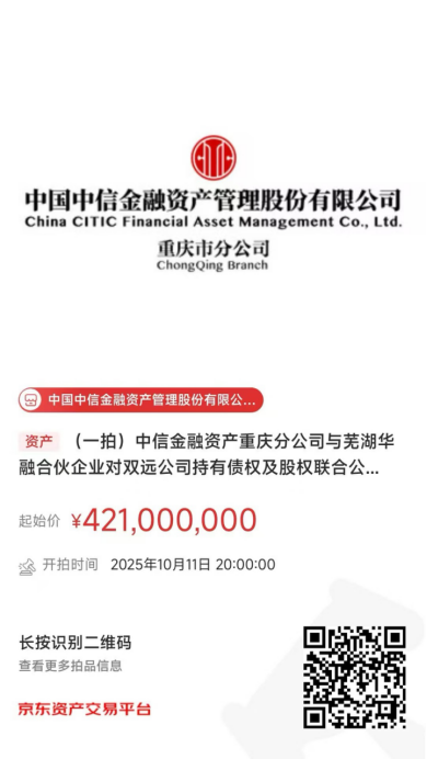 中國中信金融資產(chǎn)管理股份有限公司重慶市分公司(簡稱:中信金融資產(chǎn)重慶分公司)與蕪湖華融資本創(chuàng)榮投資中心(有限合伙)(簡稱:蕪湖華融合伙企業(yè))對重慶雙遠(yuǎn)實(shí)業(yè)(集團(tuán))有限公司(簡稱:雙遠(yuǎn)公司)持有債權(quán)及股權(quán),將于2025年10月11日20時(shí)至2025年10月12日20時(shí)在京東拍賣網(wǎng)通過公開競價(jià)方式進(jìn)行處置,拍賣鏈接如下圖所示,現(xiàn)予以公告。