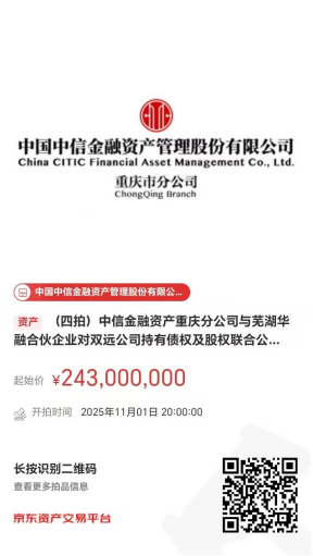 中國(guó)中信金融資產(chǎn)管理股份有限公司重慶市分公司(簡(jiǎn)稱:中信金融資產(chǎn)重慶分公司)與蕪湖華融資本創(chuàng)榮投資中心(有限合伙)(簡(jiǎn)稱:蕪湖華融合伙企業(yè))對(duì)重慶雙遠(yuǎn)實(shí)業(yè)(集團(tuán))有限公司(簡(jiǎn)稱:雙遠(yuǎn)公司)持有債權(quán)及股權(quán),將于2025年11月1日20時(shí)至2025年11月2日20時(shí)在京東拍賣網(wǎng)通過(guò)公開競(jìng)價(jià)方式進(jìn)行處置,拍賣鏈接如下圖所示,現(xiàn)予以公告。
