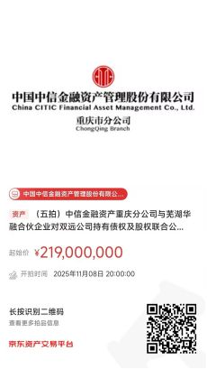 中國(guó)中信金融資產(chǎn)管理股份有限公司重慶市分公司(簡(jiǎn)稱:中信金融資產(chǎn)重慶分公司)與蕪湖華融資本創(chuàng)榮投資中心(有限合伙)(簡(jiǎn)稱:蕪湖華融合伙企業(yè))對(duì)重慶雙遠(yuǎn)實(shí)業(yè)(集團(tuán))有限公司(簡(jiǎn)稱:雙遠(yuǎn)公司)持有債權(quán)及股權(quán),將于2025年11月8日20時(shí)至2025年11月9日20時(shí)在京東拍賣網(wǎng)通過(guò)公開(kāi)競(jìng)價(jià)方式進(jìn)行處置,拍賣鏈接如下圖所示,現(xiàn)予以公告。